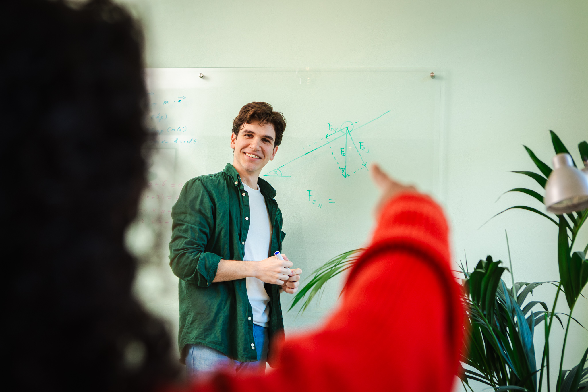 Tijdens onze lessen stellen we vooral veel vragen. We dagen leerlingen uit om zelf na te denken, en zo stap voor stap tot het juiste antwoord te komen.